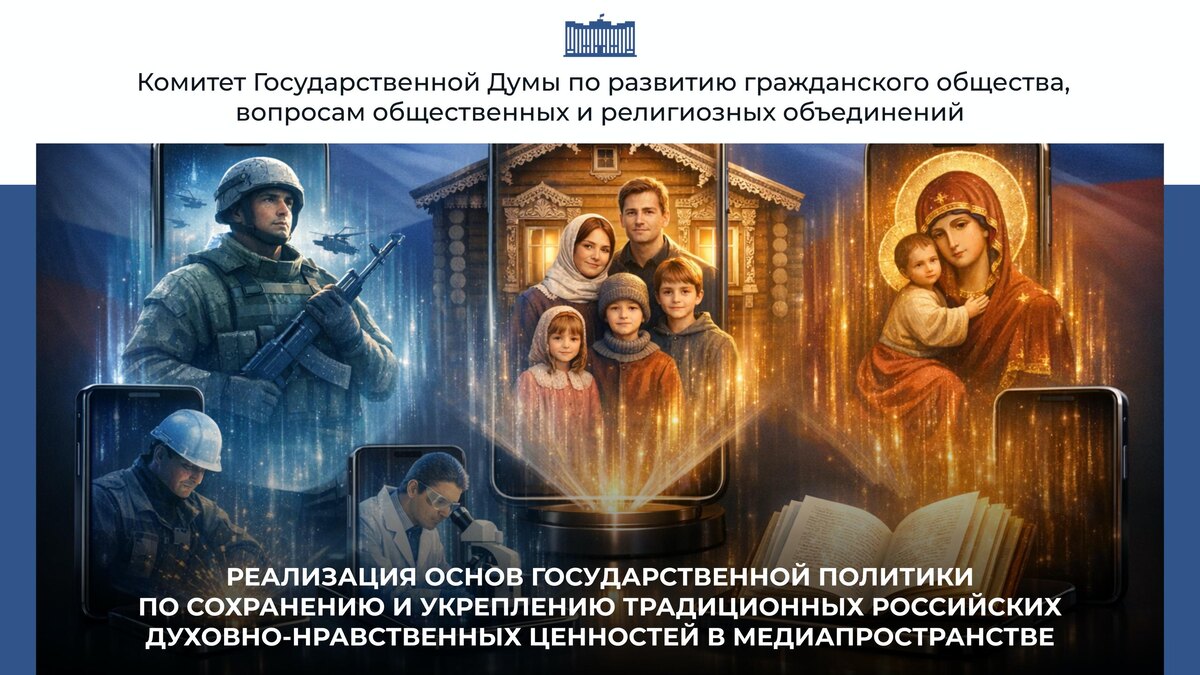 В Госдуме состоится круглый стол на тему: «Реализация Основ государственной политики по сохранению и укреплению традиционных российских духовно-нравственных ценностей в медиапространстве» Когда: 24 февраля в 16:30 Где: Государственная Дума, Георгиевский пер., д. 2, зал №830 Мероприятие организовано Комитетом ГД по развитию гражданского общества, вопросам общественных и религиозных объединений совместно с телеканалом «СПАС». Указ Президента 809 закрепил исчерпывающий перечень традиционных российских духовно-нравственных ценностей. Это жизнь, достоинство, права и свободы человека, патриотизм, гражданственность, служение Отечеству, высокие нравственные идеалы, крепкая семья, созидательный труд, приоритет духовного над материальным, гуманизм, милосердие, справедливость, коллективизм, историческая память и преемственность поколений. Сегодня ключевая задача — обеспечить их защиту и продвижение именно в медиа и цифровой среде, где формируется мировоззрение миллионов людей, особенно моло