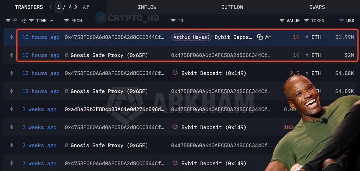👀 Артур Хейс продал 1000 ETH ($1,99m) через Bybit по средней цене ~$1999.