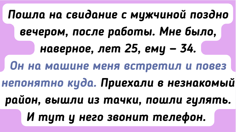 - Пошла на свидание с мужчиной поздно вечером, после работы. Мне было, наверное, лет 25, ему — 34. Он на машине меня встретил и повез непонятно куда. Приехали в незнакомый район, вышли из тачки, пошли гулять. И тут у него звонит телефон. А это его жена интересуется, где он! И мужик мне такой: «Сорян, жена нервничает, что уже поздно, а меня дома нет. Я поехал». И уехал! А я не знаю ни где я, ни что за район. Долго приходила в себя, потом долго ловила попутку. А на утро тот мужик мне звонит и как ни в чем не бывало: «Привет, как дела? Когда в следующий раз встретимся?» © hanka.Ioannka