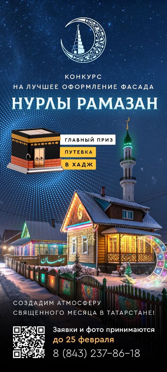 📣Внимание! Заявки на конкурс "Нурлы Рамазан" принимаются до 25 февраля! Сроки приема продлены! 🕌 Конкурс «Нурлы Рамадан» - на лучшее оформление фасадов зданий. Его проводит ДУМ РТ. 🕋 Главный приз – путевка в хадж от официального хадж-оператора «ДУМ РТ Хадж». 💫Создадим и сохраним в республике атмосферу священного месяца Рамадан! 🕌Принимайте участие в конкурсе на лучшее оформление общественных мест! ✅К участию в конкурсе приглашаются физлица, любые общественные, коммерческие, некоммерческие, частные, бюджетные, религиозные организации республики, функционирующие как пункты обслуживания населения – кафе и рестораны, магазины и ТЦ, салоны, мечети, учебные заведения, библиотеки, офисные здания, уличные площадки, места проживания и пр. ❗️Заявки на участие в конкурсе принимаются тут. ☎️Справки по телефону: +7(843)237-86-18 (с 9:00 до 17:00).