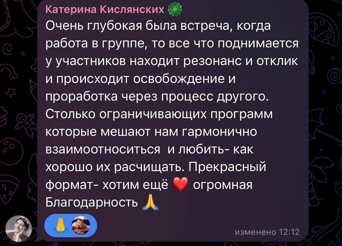Оплатить участие здесь После оплаты придет ссылка в зум, где пройдет закрытая встреча Это возможность войти в резонанс с целым полем исцеления, увидеть свои узоры в чужих историях и позволить системе перестроиться. 🔥 Как извлеть максимум глубины и пользы из расстановки: ⚫️Ищите не похожесть, а отклик в теле. Слушая запрос, отключите анализ. Спросите себя: «Где во мне отзывается это ощущение?» Тело знает ваши истинные параллели раньше ума. ⚫️Следите за образами, а не за словами. В поле работы будут всплывать символы, метафоры, чувства. Записывайте те, что задевают именно вас. Позже они сложатся в личную карту «точек сборки» для вашей реальности. ⚫️Отмечайте внутреннее сопротивление или облегчение. Если хочется отвернуться, поспорить или, наоборот, наступает тишина и покой — это ваша система откликается на касание к своей ране или ресурсу. Здесь — ваша дверь. ⚫️Дышите и держите фокус на своём центре. Ваше осознанное дыхание и внутренний вопрос: «Что сейчас сдвигается во мне?» — д