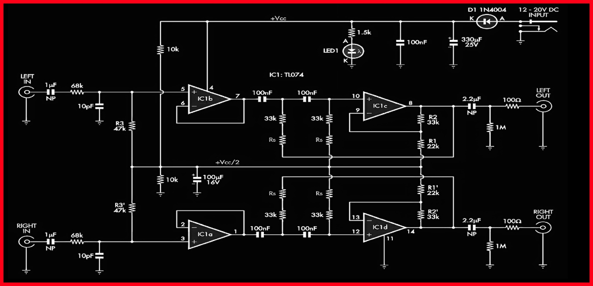 - Фильтра Саллена-Ки - ключевой элемент схемы, отвечающий за коррекцию АЧХ.