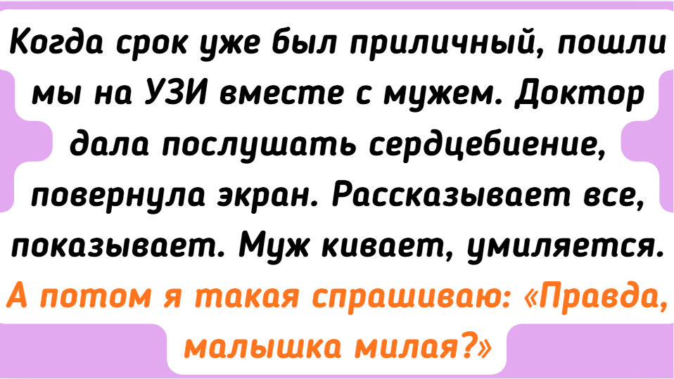 - Когда срок уже был приличный, пошли мы на УЗИ вместе с мужем. Доктор дала послушать сердцебиение, повернула экран. Рассказывает все, показывает. Муж кивает, умиляется. А потом я такая спрашиваю: «Правда, малышка милая?» А он как выдаст: «Не знаю, там все серое было, я ничего не понял».