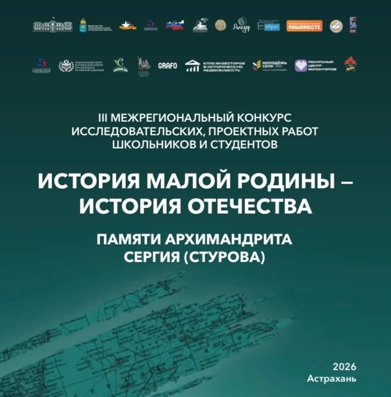 В Астраханской области продолжается прием заявок для участия в III Межрегиональном конкурсе исследовательских, проектных работ школьников и студентов «История малой Родины – история Отечества» памяти архимандрита Сергия (Стурова)» Конкурс проводится региональным отделением Ассоциации учителей истории и обществознания Астраханской области при поддержке Астраханского регионального отделения Общероссийской молодёжной общественной организации «Российский союз сельской молодежи». Прием заявок на конкурс осуществляется до 2 марта 2026 года. Его основная задача — поддержка научно-исследовательской деятельности молодежи, а также формирование устойчивого интереса к отечественной и региональной истории. В прошлом году на участие в мероприятии было подано свыше 100 заявок из нескольких регионов России, включая Донецкую Народную Республику, Белгородскую, Свердловскую, Московскую и Новосибирскую области. В этом году конкурс проводится по трём тематическим направлениям: «Родословие», «Земляки» и «Об