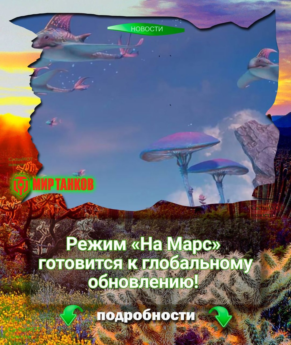! Всем привет! Разработчики начинают раскручивать интерес к игровому режиму «На Марс». Подробностей практически нет, есть только понимание, что есть такой режим игры... 🗞Что знаем: • Режим обещают кардинально изменить • По картинкам видно: нас ждёт новая атмосфера, возможно, изменённые механики. • Точно будет личная прогрессия с различным игровым имуществом. • И не обойдется без контейнеров? Возможно , туда положат новый прем — «Серп». Фан-режимы — возможность уйти в другую реальность в Мире танков... 💬А, что вы ожидаете от режима? 👍 Жду режим 👻 Покатаю по возможности 🙈 Фигня #cactuswot #наМарс #миртанков