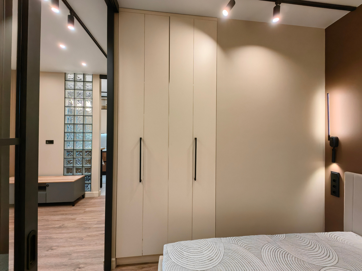 Маленькая площадь — не приговор комфорту, а вызов для дизайнера. Наша задача — не просто поставить мебель, а создать бесшовную, эргономичную среду, где каждый сантиметр работает на владельца. В проекте квартиры-студии 34 м² ключевую роль сыграла продуманная система встроенной мебели из премиум-материалов. Рассказываем, как мы превратили ограничения в преимущества. Вместо громоздкого «заплатки» в интерьере — лаконичный встроенный шкаф от пола до потока (высотой 3 метра) с распашными фасадами. Внутреннее наполнение решает все задачи прихожей: Результат: абсолютно ровная стена, максимум хранения и ни грамма визуального шума. Здесь нас ждала та же задача, но другие условия: пространство рядом со шкафом ограничено кроватью. Решение — шкаф-«близнец» по наполнению, но с другим механизмом открывания. Мы выбрали двери-гармошку (купе «книжка»). Они требуют минимум пространства перед фасадом, не блокируют проход и обеспечивают полный доступ к содержимому. Это идеальный пример того, как механика