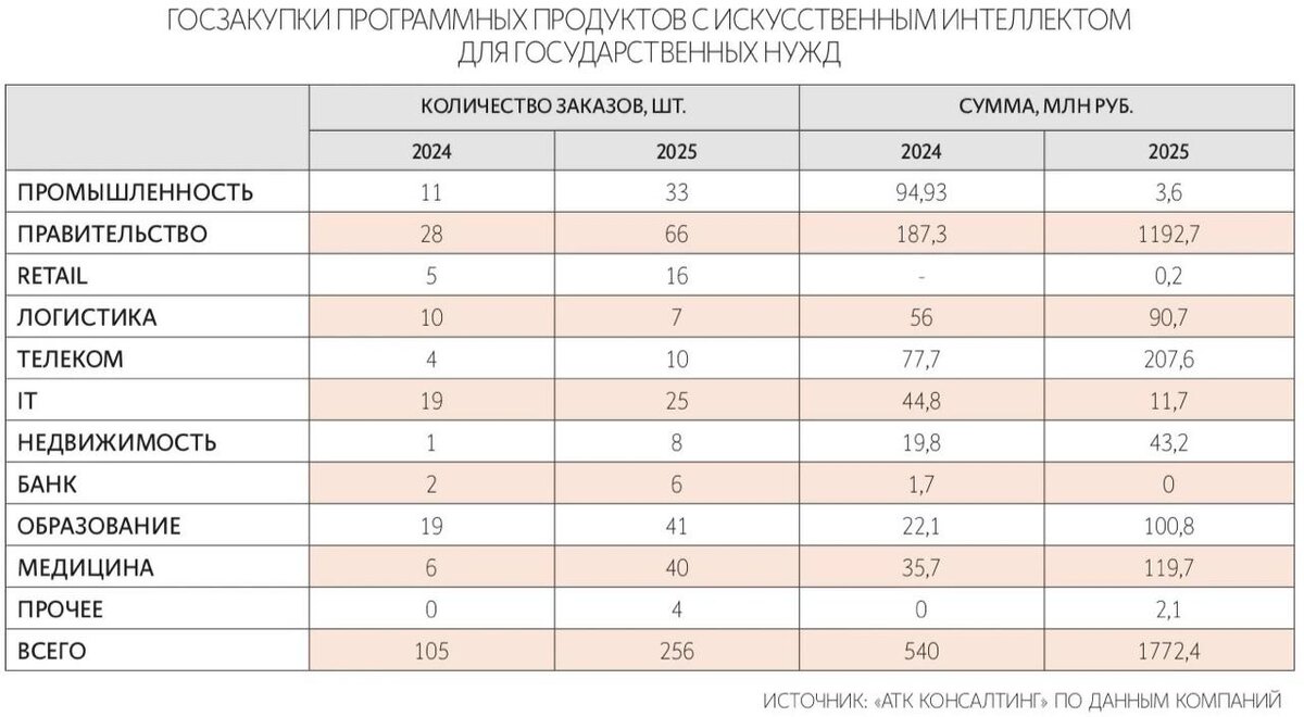 по сравнению с 2024 г. выросли в 7,4 раза до 1,8 млрд руб., подсчитали аналитики «АТК консалтинга» Госсектор (ФОИВы и РОИВы) увеличил закупки продуктов с ИИ год к году в 6,4 раза до 1,2 млрд руб., образовательные организации – в 4,6 раза до 100,8 млн руб., медицинские – в 3,4 раза до 119,7 млн руб. Телекомкомпании нарастили закупки в 2,7 раза до 207,6 млн руб., девелоперы – в 2,2 раза до 43,2 млн руб., логистические организации – на 62% до 90,7 млн руб., следует из открытых закупок на торговых площадках Открытые тендеры на 1,8 млрд руб. – сигнал тренда, а не его масштаб. Государственный сегмент формирует спрос в трех «зонах притяжения»: комплексной автоматизации госуслуг, персонализированном образовании и цифровом здравоохранении. Индустриальные закупки – в промышленности, финансовом секторе и IT – уходят в тень корпоративных рамок В части ПО и оборудования с ИИ по 44-ФЗ (регулирует государственные и муниципальные закупки) сумма закупок почти удвоилась до 2,9 млрд руб., а их количе