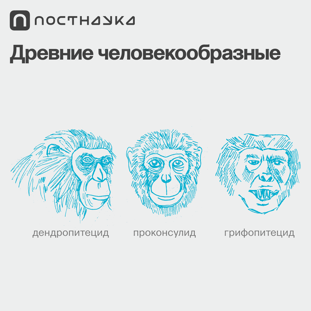 Человекообразные обезьяны (надсемейство Hominoidea) возникли в конце олигоцена одновременно с мартышкообразными. В отличие от последних, они сделали ставку на социальность и высокий уровень энцефализации. На протяжении миоцена человекообразные процветали в густых тропических лесах, но позднемиоценовое похолодание почти полностью сократило их численность. Сохранились лишь специализированные группы: гиббоны, орангутаны, гориллы, шимпанзе и люди. Чем человекообразные отличались от других приматов: https://postnauka.org/wtf/157885
