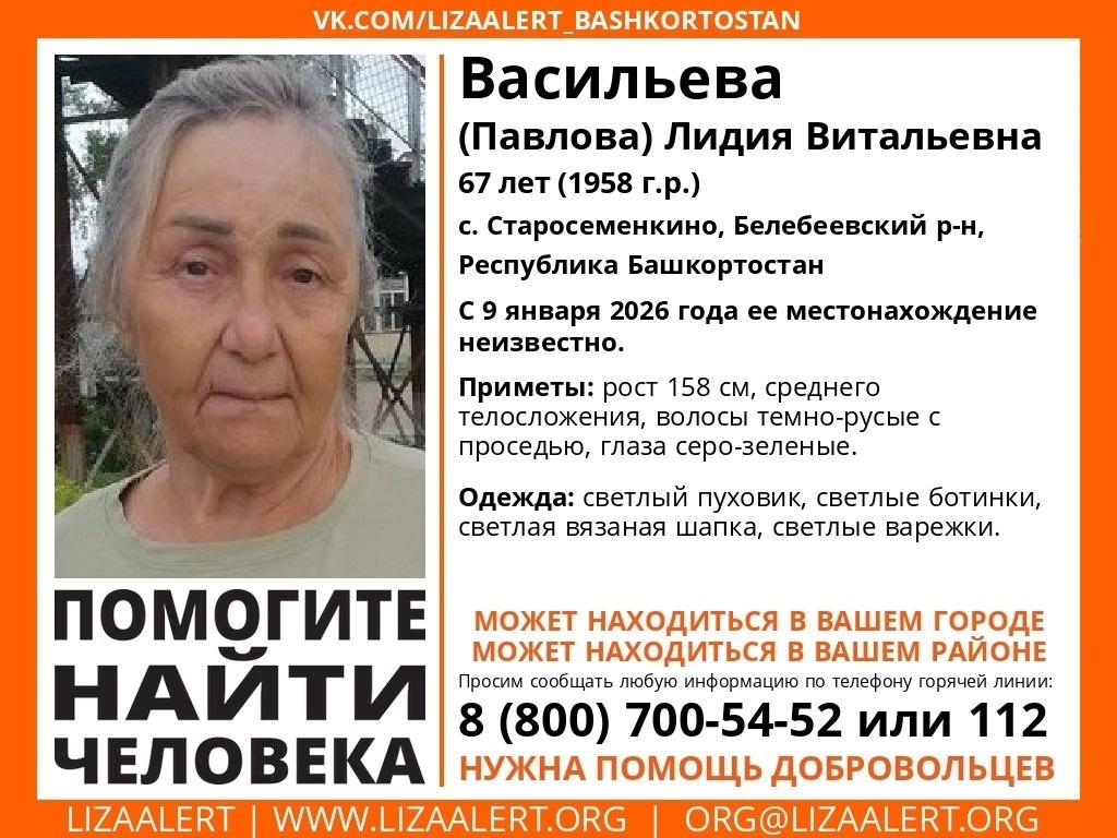 Поиски 67-летней Лидии Васильевой (Павловой) ведутся с 9 января. По данным «Лиза Алерт» РБ, жительница села Старосеменкино была одета в светлый пуховик, ботинки, вязаную шапку и варежки. Особые приметы — рост 158 см, среднее телосложение, темно-русые волосы с проседью и серо-зеленые глаза. Любую информацию о ее возможном местонахождении просят сообщать по телефону 8 (800) 700-54-52 или 112.