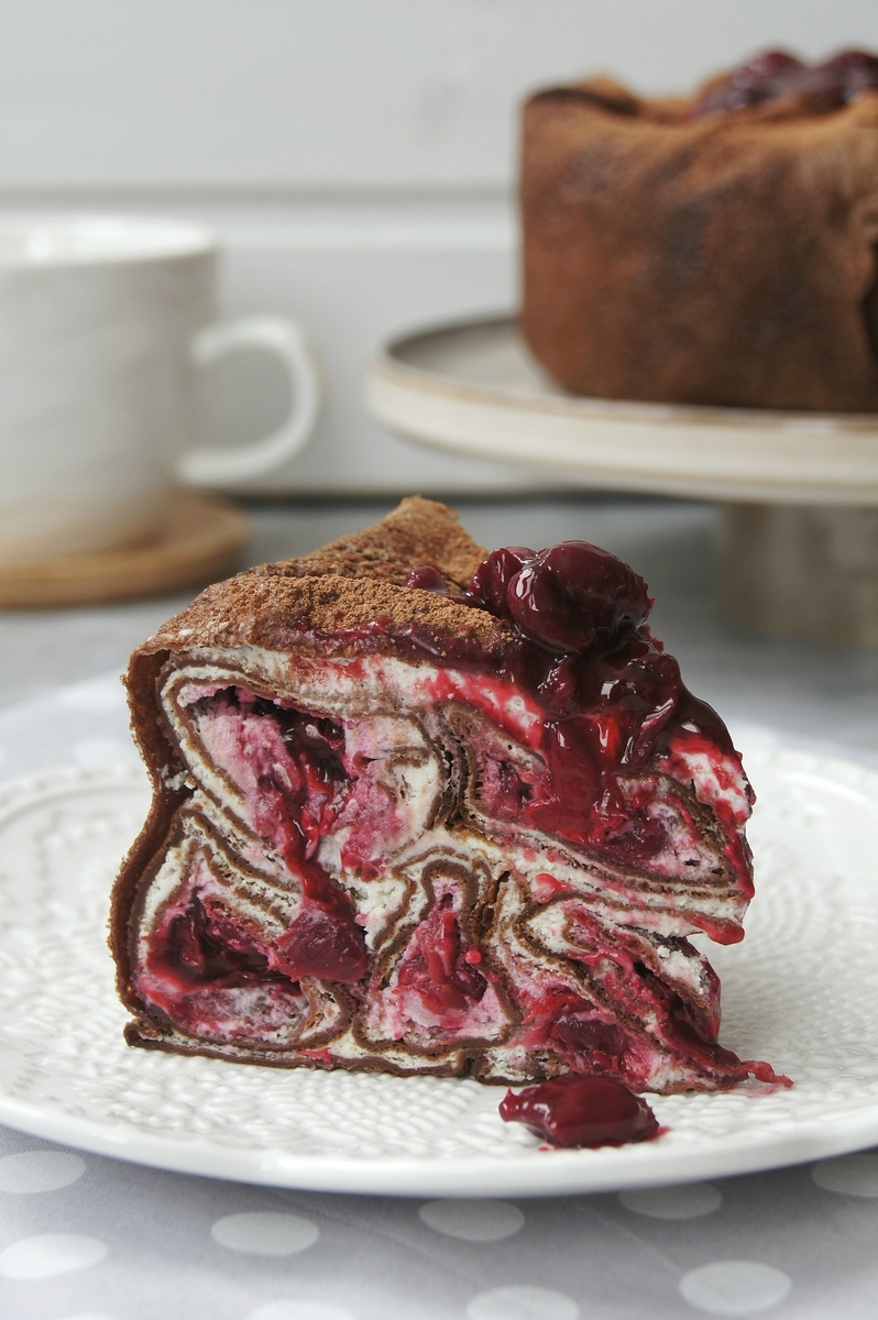 Рецепт Шоколадно-кофейного блинного торта с вишней. Такой вкусный, нежный, в меру сладкий блинный торт можно приготовить на Масленицу или просто к домашнему чаепитию. Сочетание шоколадных блинчиков, вишневой начинки и нежного сливочного крема никого не оставит равнодушным.