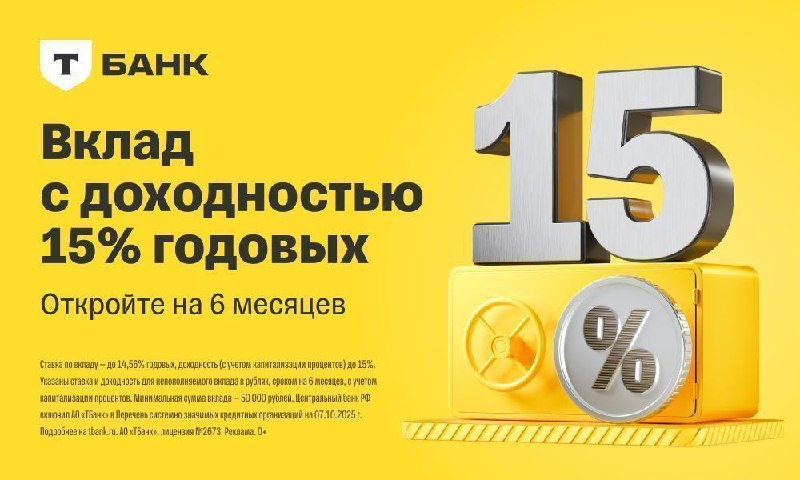 Вклад, надёжный как скала — вариант для тех, кому важна безопасность. В Т-Банке можно открыть вклад с доходностью 15% на 6 месяцев. Всё это с удобным пополнением без комиссии через СБП до 30 000 000 ₽ в месяц. Оформление занимает пару минут онлайн. ────────── ⚡️Важные новости – без лишнего шума!⚡️ Подпишись на канал и получай только суть: оперативно, чётко, по делу! 👉 ИнфоСплетник | @infospletnik