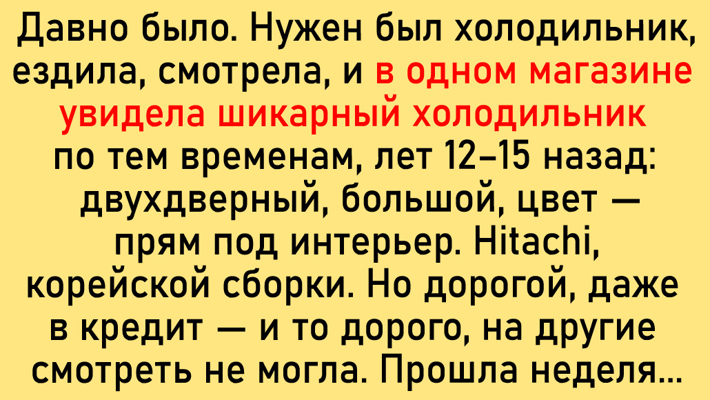 1998 год, учусь в вузе в Москве, единственная из группы живу в общаге, остальные — москвичи. Как-то вечером после пар все задержались у меня, что-то отмечали. Потом пошли к метро, я с ними — провожать. Со всеми распрощались, последнюю девочку посадила на автобус и в сугробе на остановке вижу 2 купюры по 50 долларов. Приятная добавка к стипендии. © Елена Л. / Dzen Давно было. Нужен был холодильник, ездила, смотрела, и в одном магазине увидела шикарный холодильник по тем временам, лет 12–15 назад: двухдверный, большой, цвет — прям под интерьер. Hitachi, корейской сборки. Но дорогой, даже в кредит — и то дорого, на другие смотреть не могла. Прошла неделя. Захожу в магазин напротив того, где видела холодильник, а там — точно такой же. Акция выходного дня: он дешевле (уже не помню) тысяч на 10–12, и в подарок шнековая соковыжималка. Конечно, взяла его. Служит верой и правдой уже много лет, а вот соковыжималкой пользуемся нечасто — она у нас 2 года стояла нераспакованная. © Uwanova Lyubov /