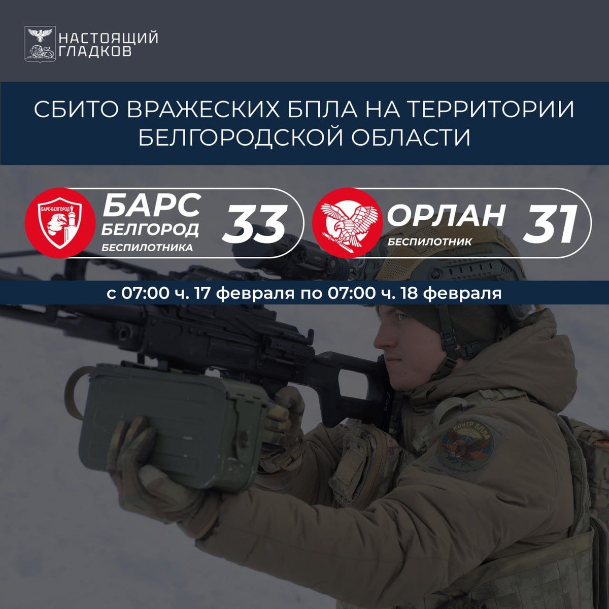 » С 07:00 ч. 17 февраля по 07:00 ч. 18 февраля ликвидированы 64 беспилотника «БАРС-Белгород» — 33 беспилотника:** 📍подавлены РЭБ: — Краснояружский округ: 22 FPV-дрона; — Шебекинский округ: 2 FPV-дрона. 📍 сбит из стрелкового оружия: — Белгородский округ: 1 БПЛА самолётного типа; — Грайворонский округ: 1 FPV-дрон; — Краснояружский округ: 3 FPV-дрона; — Шебекинский округ: 2 FPV-дрона и 1 БПЛА типа «Дартс». 📍 средствами противодействия БПЛА сбит: — Краснояружский округ: 1 разведывательный БПЛА RaeFly VT260 VTOL. **«Орлан» — 31 беспилотник: ** 📍подавлены РЭБ: — Белгородский округ: 6 FPV-дронов и 1 БПЛА самолётного типа; — Валуйский округ: 3 FPV-дрона; — Волоконовский округ: 2 FPV-дрона; — Краснояружский округ: 6 FPV-дронов и 1 БПЛА самолётного типа. 📍 сбиты из стрелкового оружия: — Белгородский округ: 4 FPV-дрона; — Волоконовский округ: 1 FPV-дрон; — Грайворонский округ: 2 FPV-дро