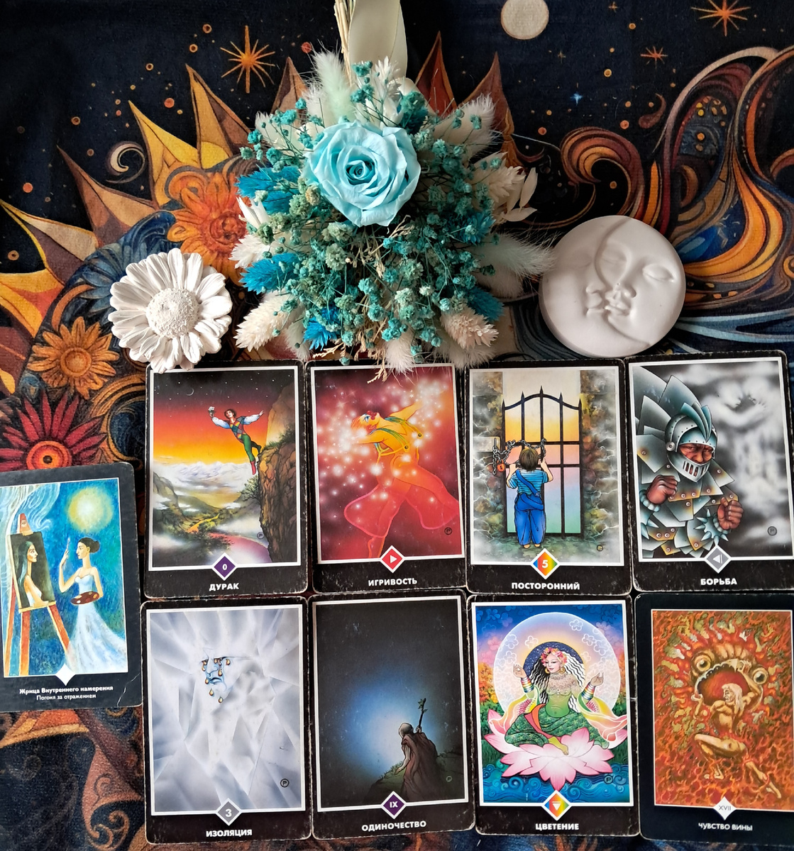 Судя по всему, вы находитесь в кризисе перехода. Старое рушится или изолируется, новое еще не родилось. Присутствует сильная боль (одиночество, борьба), но также и огромный потенциал (Дурак, Цветение, Жрица).