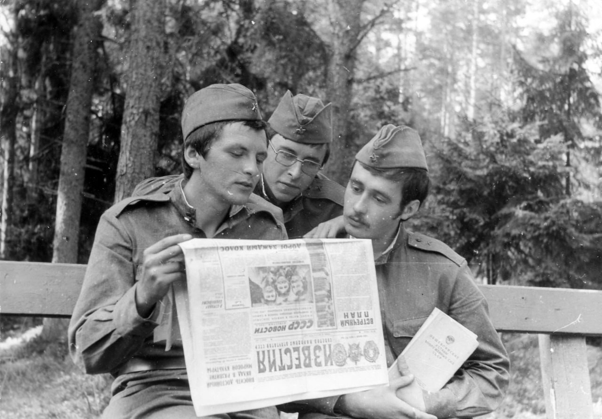 Трое рядовых артиллерии изучают передовицу в газете "Известия", 1979 год