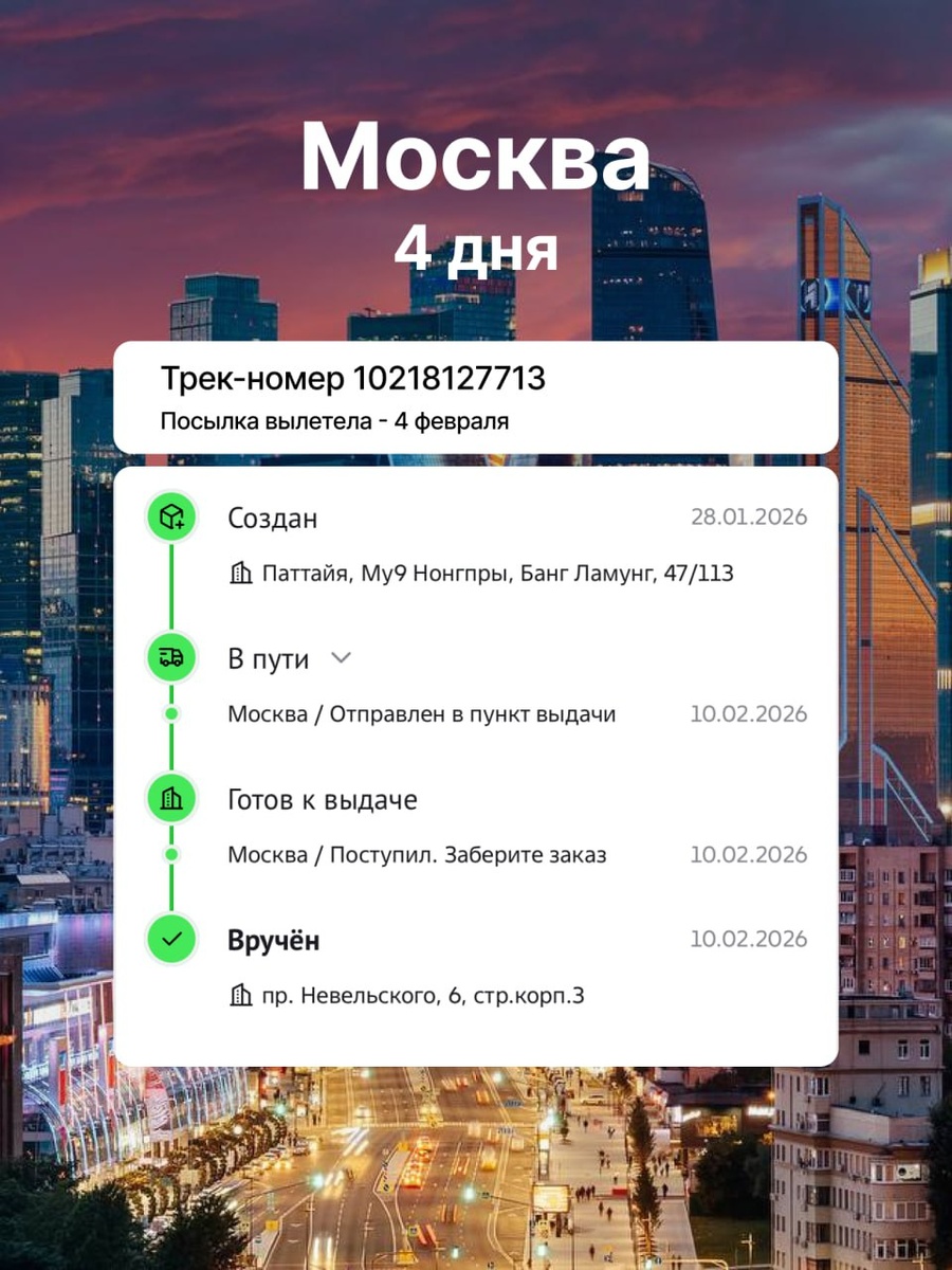 Обновленная статистика по срокам доставки ваших заказов, чтоб понимать, сколько уходит времени на доставку из Тайланда до вашего города ⤵ 📍 4–10 дней: Москва, Санкт-Петербург, Смоленск, Новосибирск, Пенза, Певек, Лыткарино, Ростов-на-Дону, Барнаул, Нижегородская область, Щербинка, Калининград, Челябинск, Калуга, Чехов, Петропавловск-Камчатский, Хабаровск, Воротынск, Мурино, Киров 📍 11–15 дней: Екатеринбург, Тула, Тверь, Подольск, Ленинградская область, Саратов, Самара, Минеральные Воды, Отрадный, Белгород, Севастополь, Ростов-на-Дону, Волгоград, д. Трубичино 📍 16+ дней: Владивосток, Ставрополь, Соколово, Кабардино-Балкарская республика, Забайкальский край Теперь о сроках ближайшего вылета: 6 марта - ближайшая отправка До 24 февраля (включительно) принимаю корзины на эту отправку Доставка: от 5 до 20 дней (после вылета посылки в РФ) курьером или в ПВЗ СДЭК. Прием заказов на сайте sheinfly.ru Условия / Тарифы / Отзывы