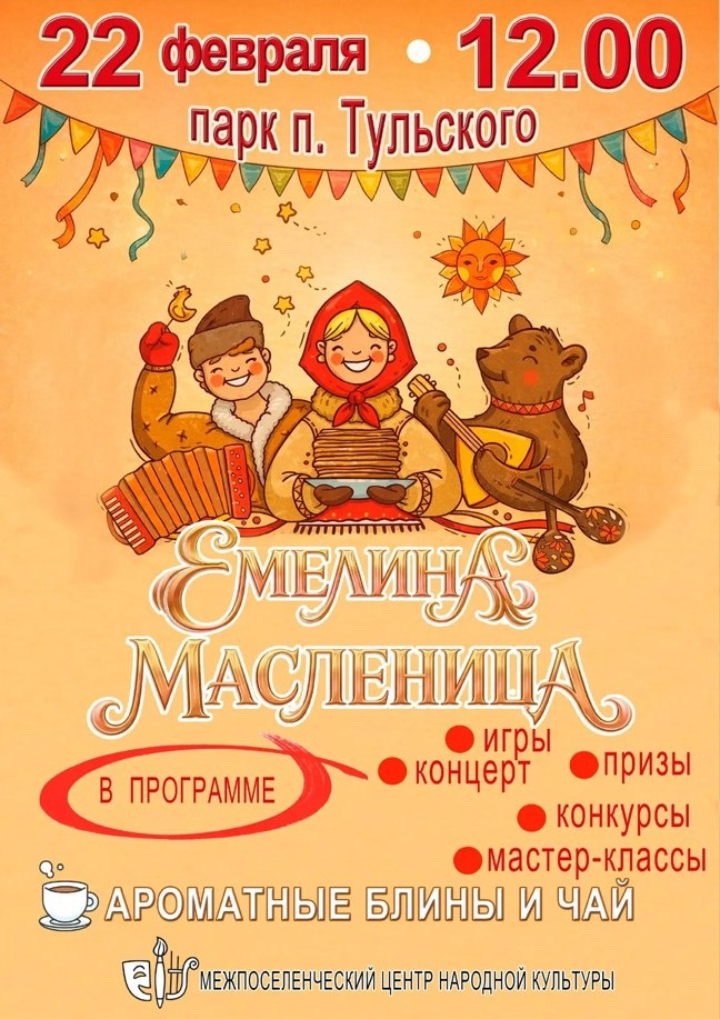 📍 22 февраля в 12:00 в парке п. Тульского пройдет "Емелина Масленица"! Вас ждет насыщенная программа и ароматный чай с блинами.🥞