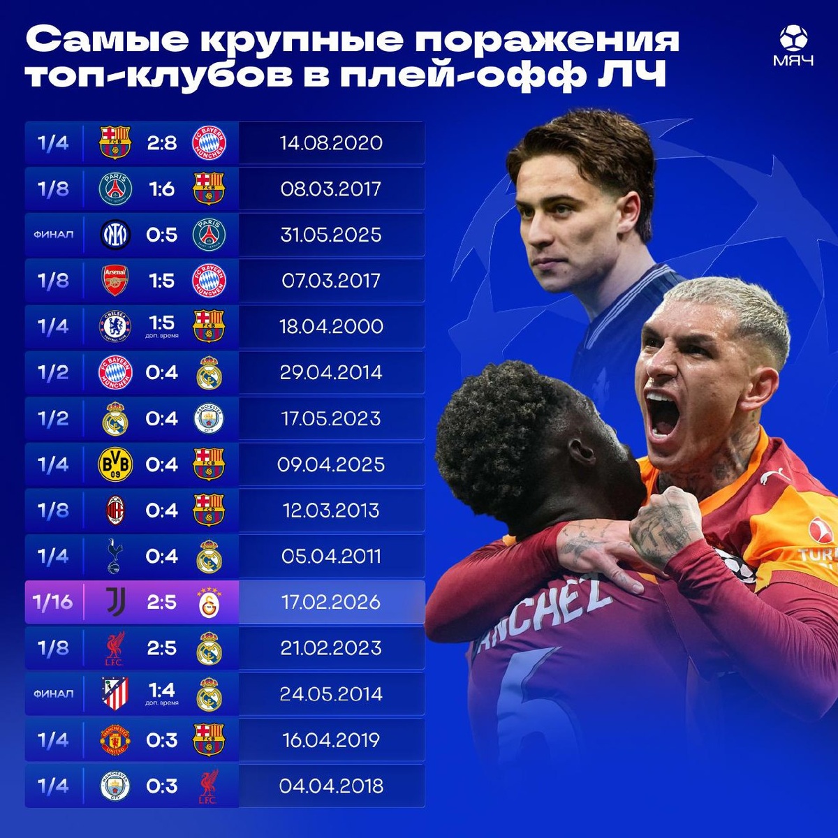 А что там у других? Турки (из-за количества забитых) сменили «Реал» в списке главных палачей туринского клуба (громили 4:1 и 3:0 в 2017-м и 2018-м), однако данное фиаско и близко не самое болезненное. В 2020-м «Барселона» устроилась на 2:8 от «Баварии», «ПСЖ» попадал под ту самую Ремонтаду (1:6), а «Интер» был бит парижанами 0:5 в финале ЛЧ-2025. А вот у «МЮ» с «Ман Сити» – самые рядовые лузы. 0:3 от «Барселоны» и «Ливерпуля» соответственно. @myach