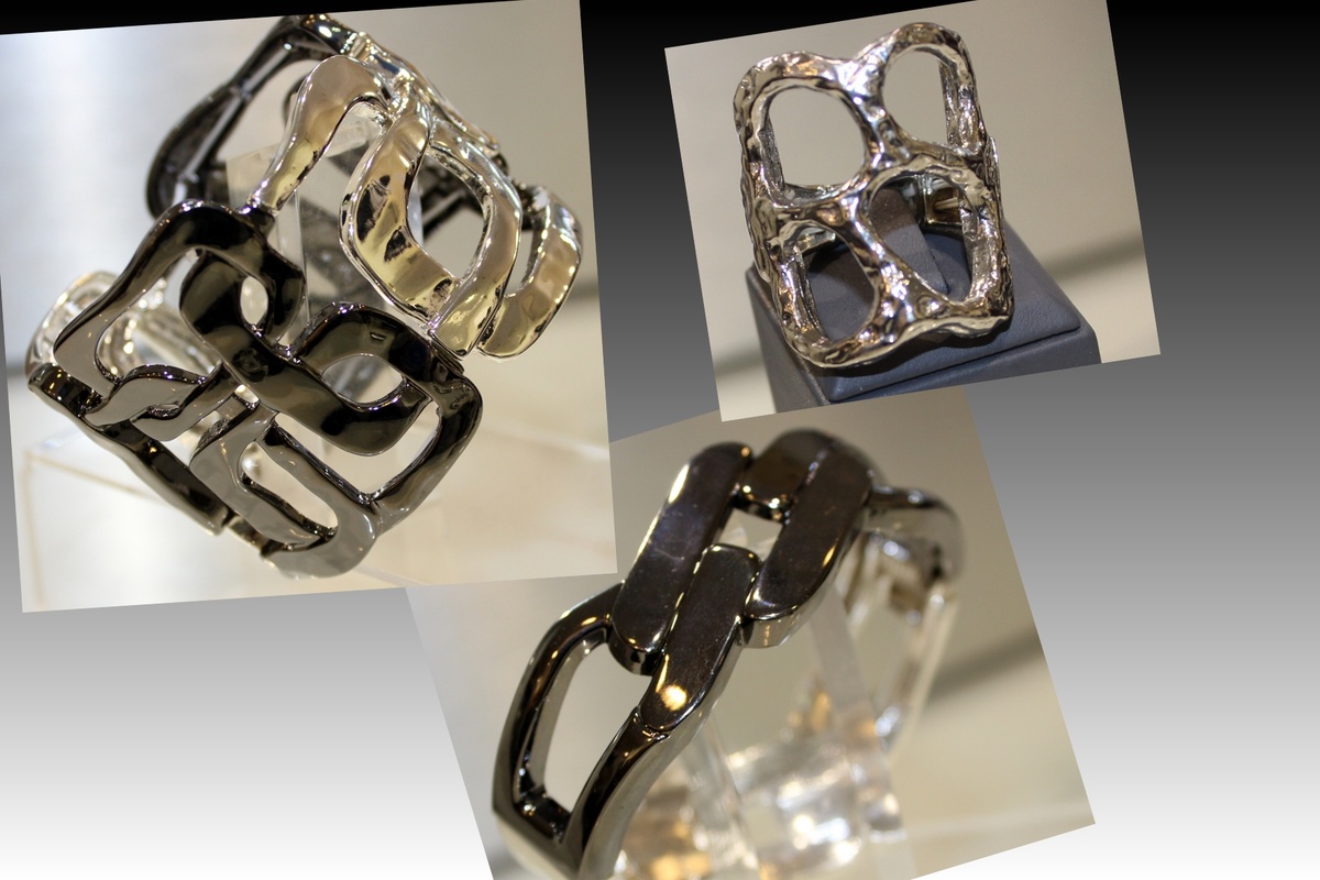 Первое, на что обращаешь внимание, это сложные, "текучие" переплетения в браслетах и кольцах с тональным переходом оттенков. Эта витиеватость доходит до откровенных спиралек, узлов, ажура и воздушной