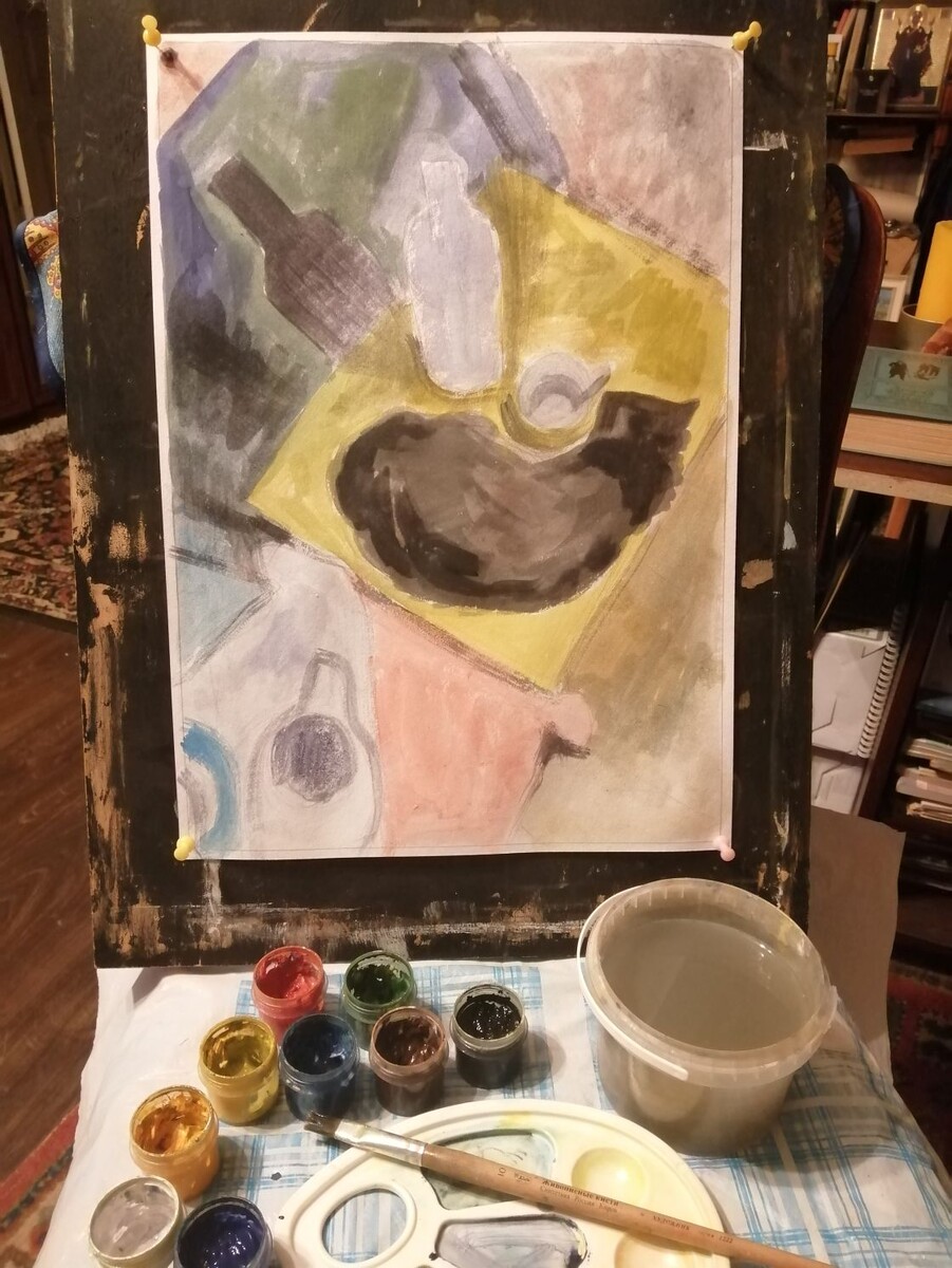Несколько недель подряд я рисовала пастелью - иногда необходимо сменить материал работы. Другой материал - новый взгляд, а вслед за этим приходит интерес и вдохновение. Для основы под пастель я использовала не специальную бумагу, а подложку/подмалёвок гуашью по ватману или бумаге из альбомов для рисования (главное, чтобы была плотная). Вот эскиз формата А3, выполненный гуашью: А здесь уже гуашевый подмалёвок на формате А2 (половина ватмана, это примерно 40х60): Когда гуашь полностью высохла (я оставляла работу на несколько дней), можно работать сухой мягкой пастелью.