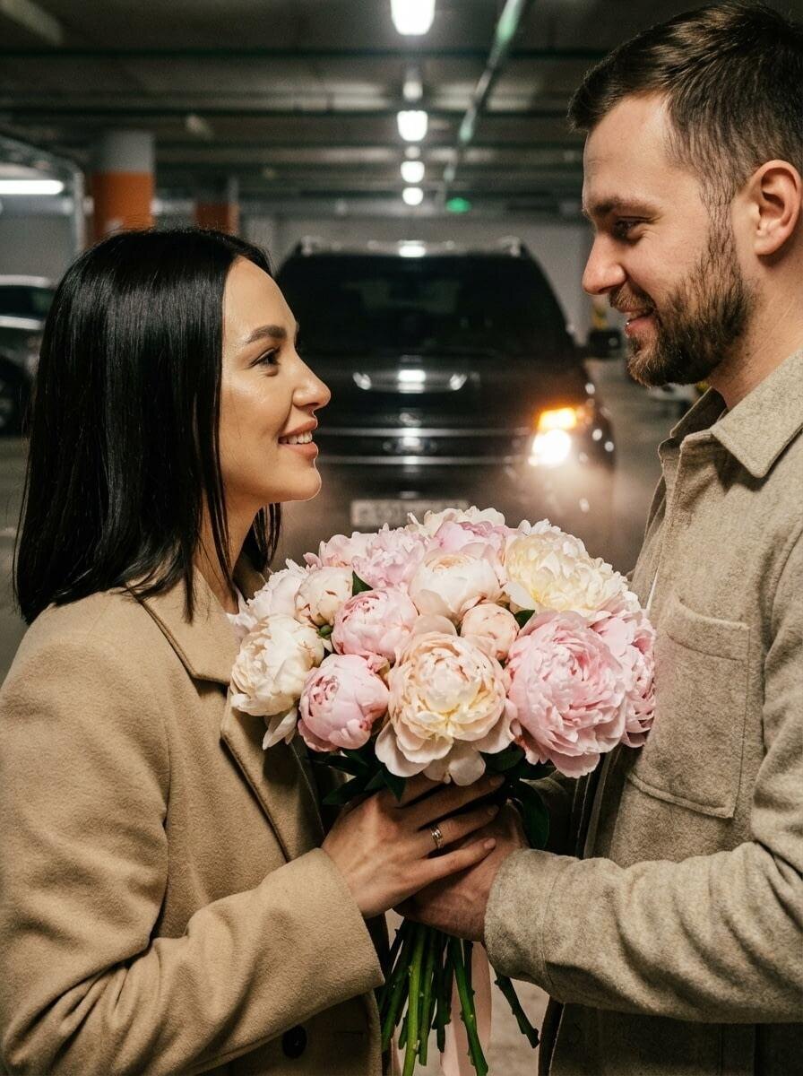 Модель: Nano Banana Сгенерировать🪄 Используй лица мужчины и женщины с загруженных фото. Экстремально крупный план, снятый в формате RAW с кинематографичной плёночной зернистостью. Тёплый, интимный момент между мужчиной и женщиной в пространстве подземного паркинга. Черты лица обоих должны быть сохранены строго 1:1 в соответствии с референсами. Сцена и атмосфера: Подземный паркинг с приглушённым, атмосферным освещением. Мужчина дарит женщине огромный, пышный букет свежих пионов — цветы занимают значительную часть кадра, их лепестки нежные, объёмные, с бархатистой текстурой. Жест выглядит естественным, спонтанным, наполненным заботой и теплом. Персонажи и образы: Мужчина: в стильном бежевом пальто или куртке из плотной, фактурной ткани. Образ сдержанный, элегантный, с мягкой цветовой доминантой. Женщина: одета в мягкое, премиальное пальто из бежевой шерсти. Её волосы — идеально прямые, блестящие, свободно ниспадающие вниз. Макияж деликатный, нюдовый: длинные натуральные ресницы, пухлые