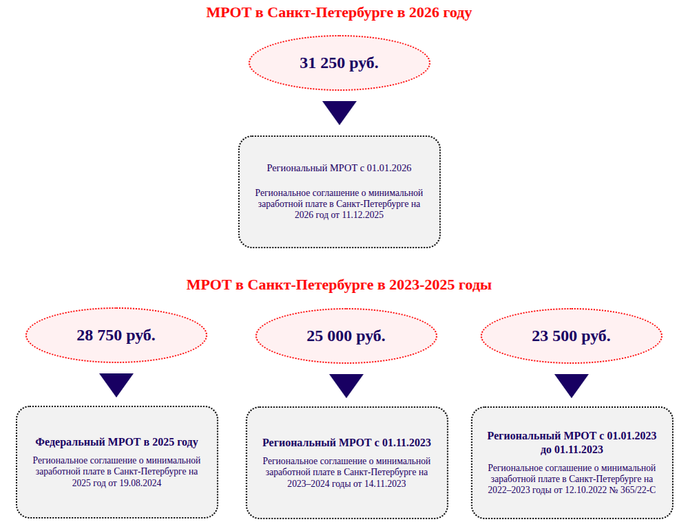 Для ответа на вопрос, какой применять МРОТ в Санкт-Петербурге в 2026 году, потребуется учесть положения следующих нормативно-правовых актов: В 2025 году действуют два нормативно-правовых акта: для федерального МРОТ и регионального - Региональное соглашение о минимальной заработной плате в Санкт-Петербурге на 2026 год от 11.12.2025. На федеральный МРОТ в СПб в 2026 году ориентируются организации, финансируемые из федерального бюджета. Региональный МРОТ применяется работодателями, подписавшими указанное соглашение или присоединившимися к нему в установленном ТК РФ порядке. Для компаний и ИП-работодателей, не вошедших в перечисленные группы, альтернативы не остается. Для них действует правило: сотрудникам, отработавшим установленную ежемесячную норму труда, выплачивается зарплатное вознаграждение в размере не ниже федерального МРОТ. Ознакомьтесь с определением МРОТ по ТК РФ. В отличие от большинства региональных МРОТ установленная в СПб региональная зарплатная минималка имеет особенности