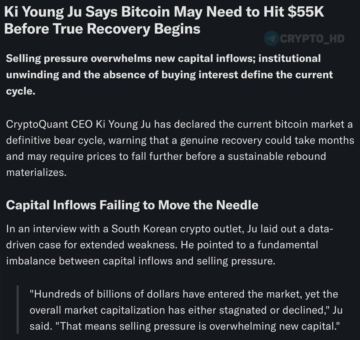 ΠΎΠ΄ΠΈΡΡΡ Π² ΠΏΠΎΠ»Π½ΠΎΡΠ΅Π½Π½ΠΎΠΉ ΠΌΠ΅Π΄Π²Π΅ΠΆΡΠ΅ΠΉ ΡΠ°Π·Π΅, Π° Π΄Π»Ρ ΡΡΡΠΎΠΉΡΠΈΠ²ΠΎΠ³ΠΎ Π²ΠΎΡΡΡΠ°Π½ΠΎΠ²Π»Π΅Π½ΠΈΡ ΠΌΠΎΠ³ΡΡ ΠΏΠΎΡΡΠ΅Π±ΠΎΠ²Π°ΡΡΡΡ ΠΌΠ΅ΡΡΡΡ. β€ ΠΠ΅ΡΠΌΠΎΡΡΡ Π½Π° ΠΏΡΠΈΡΠΎΠΊ ΡΠΎΡΠ΅Π½ ΠΌΠΈΠ»Π»ΠΈΠ°ΡΠ΄ΠΎΠ² $, ΠΊΠ°ΠΏΠΈΡΠ°Π»ΠΈΠ·Π°ΡΠΈΡ ΡΡΠ°Π³Π½ΠΈΡΡΠ΅Ρ β Π΄Π°Π²Π»Π΅Π½ΠΈΠ΅ ΠΏΡΠΎΠ΄Π°Π²ΡΠΎΠ² ΠΏΡΠ΅Π²ΡΡΠ°Π΅Ρ ΡΠΏΡΠΎΡ. β€ ΠΡΠΈΡΠΎΠΊΠΈ Π² ETF Π·Π°ΠΌΠ΅Π΄Π»ΠΈΠ»ΠΈΡΡ, Π²Π½Π΅Π±ΠΈΡΠΆΠ΅Π²ΠΎΠΉ ΡΠΏΡΠΎΡ ΠΎΡΠ»Π°Π±. β€ ΠΠ½ΡΡΠΈΡΡΡΠΈΠΎΠ½Π°Π»Ρ ΡΠΎΠΊΡΠ°ΡΠ°ΡΡ ΠΏΠΎΠ·ΠΈΡΠΈΠΈ ΠΈ Π²ΡΠ²ΠΎΠ΄ΡΡ ΠΊΠ°ΠΏΠΈΡΠ°Π». β€ Π€ΠΈΠΊΡΠΈΡΡΡΡΡΡ Π°Π³ΡΠ΅ΡΡΠΈΠ²Π½ΡΠ΅ ΠΏΡΠΎΠ΄Π°ΠΆΠΈ ΠΊΡΡΠΏΠ½ΡΠΌΠΈ ΠΎΠ±ΡΠ΅ΠΌΠ°ΠΌΠΈ. ΠΠΎΠ·ΠΌΠΎΠΆΠ½ΡΠ΅ ΡΡΠ΅Π½Π°ΡΠΈΠΈ: 1. Π‘Π½ΠΈΠΆΠ΅Π½ΠΈΠ΅ BTC Π΄ΠΎ ~$55k Ρ ΠΏΠΎΡΠ»Π΅Π΄ΡΡΡΠΈΠΌ ΡΠ°Π·Π²ΠΎΡΠΎΡΠΎΠΌ. 2. ΠΠ΅ΡΡΡΡ Π±ΠΎΠΊΠΎΠ²ΠΈΠΊΠ° Π² Π΄ΠΈΠ°ΠΏΠ°Π·ΠΎΠ½Π΅ $60β70k ΠΏΠ΅ΡΠ΅Π΄ Π½ΠΎΠ²ΡΠΌ Π²ΠΎΡΡ