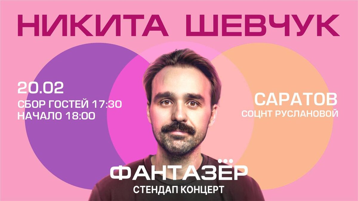СОЦНТ им. Руслановой 20 февраля 18:00 Standup Никита Шевчук "Фантазёр" Непредсказуемый, острый на язык и самобытный — Никита Шевчук с новой программой "Фантазер". Никита открывает двери в мир своих самых смелых фантазий и тонких наблюдений, превращая обыденное в смешное и неожиданное. В концерте «Фантазер» звучат шутки, которых еще нет в интернете, вы точно их не видели. 18+ 🎫 Билеты на сайте: shevchuknikita.com ВК: https://vk.com/shevchukstandup
