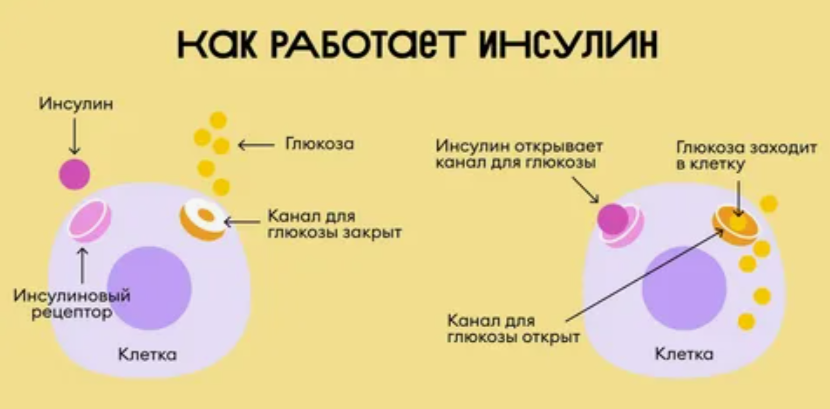 Простыми словами, представьте, что у нас есть клетка, клетка должна отдавать организму энергию, не только чтобы мы двигались, но и чтобы у нас работал весь организм. Энергия образуется из глюкозы, клетка – это дверь, инсулин – это ключ к двери, инсулин открывает дверь и глюкоза заходит в клетку. Если инсулина становится слишком много, то инсулин уже не открывает дверь, а глюкоза не заходит в клетку. Энергия не производится, инсулин накапливается, глюкоза повышается в крови.