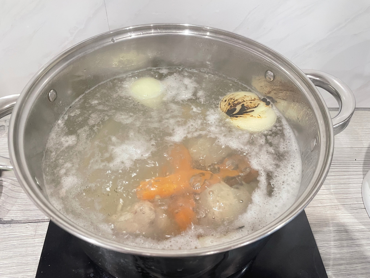 Положил куриные ножки в кастрюлю, залил холодной водой и поставил вариться. Отдельно на сухой сковородке припёк луковицу разрезанную пополам и морковь (тоже разрезанную пополам вдоль)