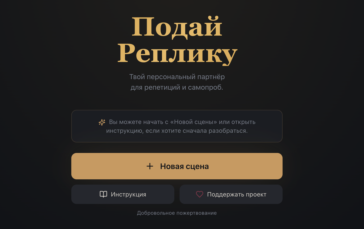 Дорогие коллеги! Я хочу рассказать вам не просто про приложение, а про необходимость, из которой оно родилось. Сколько раз мы оказывались в ситуации, когда репетировать нужно, а партнёра нет? Когда текст уже выучен, но хочется ещё раз пройти сцену в живом темпе: почувствовать паузу, услышать реплику, ответить не в пустоту, а партнёру. Я много раз ловил себя на этом: вот ходишь ты по комнате, проговариваешь чужие фразы сам и… путаешься в ритме, сбиваешься. Именно в такой момент у меня появилась идея создать приложение «Подай Реплику». Это интерактивный цифровой суфлёр для актёров: ты загружаешь текст, программа разбирает сцену по персонажам, и ты можешь работать над своей ролью в одиночку. Реплики партнёра подаются в нужный момент, ты реагируешь, держишь темп, сохраняешь внутреннее напряжение. Важно отметить, что я делал это не как разработчик, а как актёр, которому нужен простой инструмент без лишних функций. Для меня создание подобного проекта — дань уважения профессии. Безусловно, эт