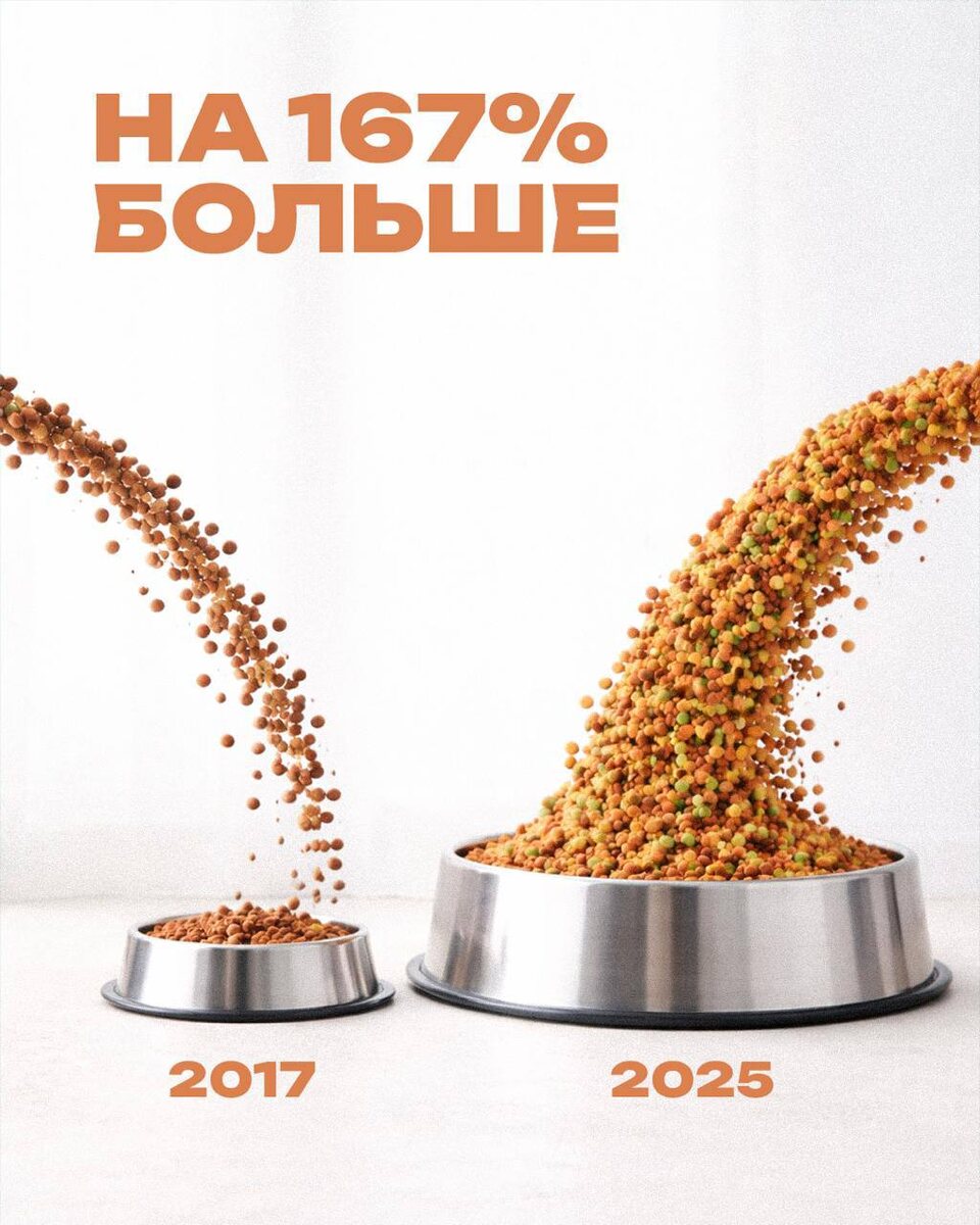 По данным аналитического агентства Feedlot, в 2025 году производство кормов продолжило расти как в сегменте влажных, так и в сегменте сухих рационов, а динамика по сравнению с 2017 годом остается положительной. Влажный сегмент развивается равномерно: среднегодовой темп роста за период 2017–2025 годов составил 9%. Объем производства увеличился с 375,5 тыс. тонн в 2017 году до 741,9 тыс. тонн в 2025 году. Это означает прирост на 98% к уровню 2017 года и дополнительно +5% к 2024 году. Сухой сегмент демонстрирует более высокую динамику. Среднегодовой темп роста за 2017-2025 годы составил 13%, а объем производства вырос с 335 тыс. тонн до 893,8 тыс. тонн. Прирост к 2017 году составил 167%, к 2024 году – 13%. Российский рынок кормов нельзя назвать медленно развивающимся. Однако высокая динамика производства и активный запуск новых брендов постепенно усилили конкуренцию. В результате чего, вход для новых игроков стал существенно сложнее, а требования к позиционированию, дистрибьюции и мар