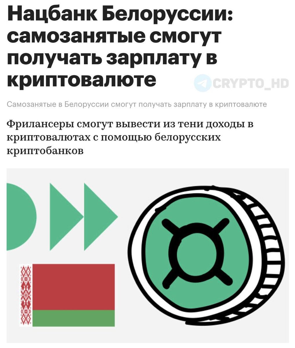 Национальный банк Республики Беларусь объявил, что самозанятые смогут легально получать оплату за свои услуги в криптовалюте. Что меняется: ▪ Фрилансеры, работающие с иностранными заказчиками, смогут официально принимать оплату в криптоактивах. ▪ Доходы можно будет зачислять через специальные криптобанки. ▪ Появится возможность оплачивать налоги с таких поступлений. ▪ По картам криптобанков станет доступна оплата в магазинах, при этом конвертация в фиат будет происходить автоматически. Crypto Headlines