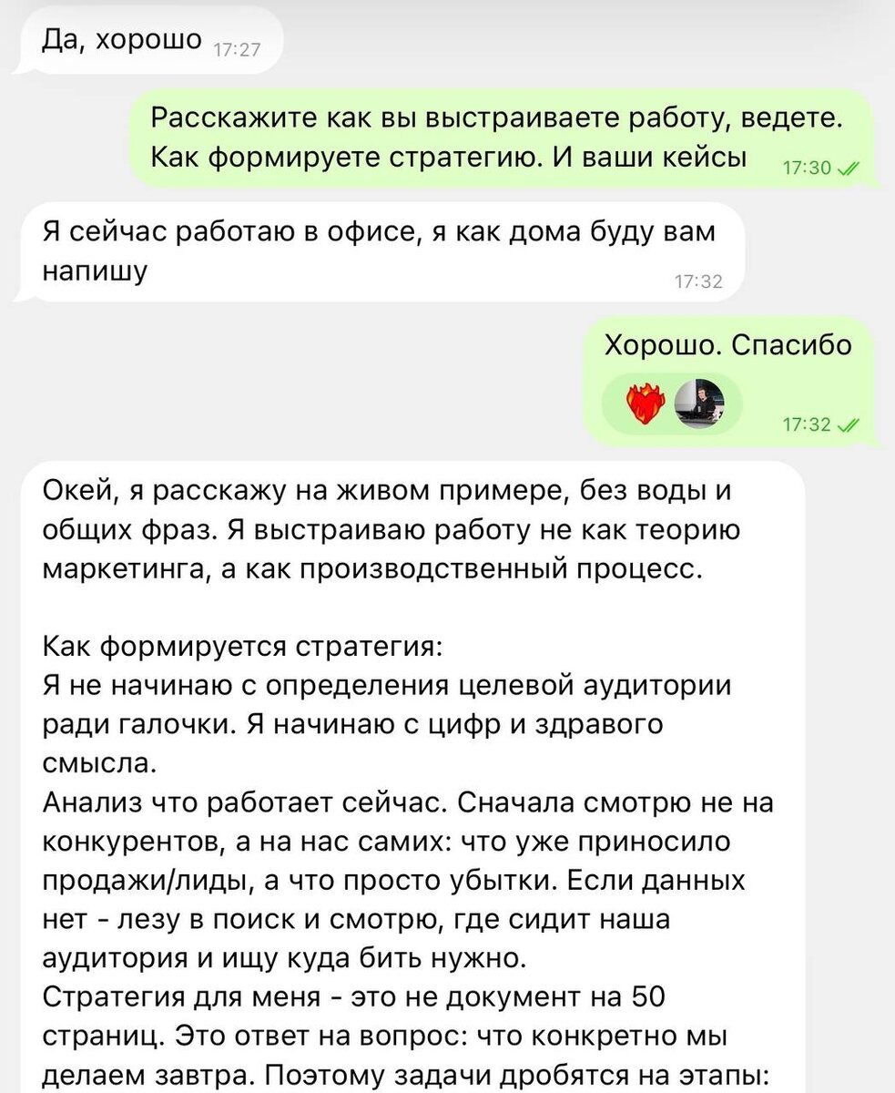 … Видимо, мой следующий ход должен выглядеть как-то так: Окей. Без лишних слов, только по факту, сразу к сути. Отвечаю на ваше сообщение (соискателя). Зависит от задачи. Я - собственник, строю бренды. Мне важны структура, амбиции и адекватность. Поэтому мой ответ не должен быть «HR-формальностью», а сразу фильтровать уровень. Ниже - готовые варианты под разные ситуации…