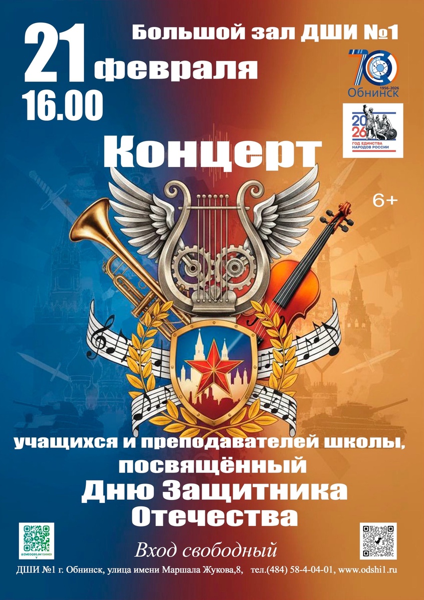 🎶21 февраля в 16:00 в ДШИ №1 в Обнинске состоится концерт, посвящённый Дню защитника Отечества.