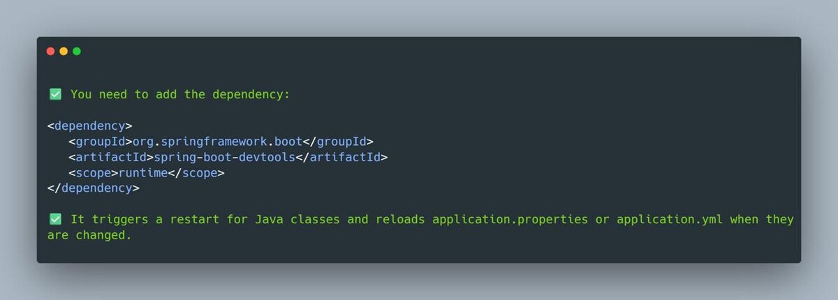DevTools делает жизнь проще: следит за изменениями в коде и конфиге и автоматически перезагружает приложение. Что даёт: ✅ Auto-restart при изменениях Java-классов ✅ Авто-рефреш application.properties / application.yml ✅ Быстрее итерации - меньше ручных рестартов, больше скорости разработки Подключение (Maven): <dependency> <groupId>org.springframework.boot</groupId> <artifactId>spring-boot-devtools</artifactId> <scope>runtime</scope> </dependency>
