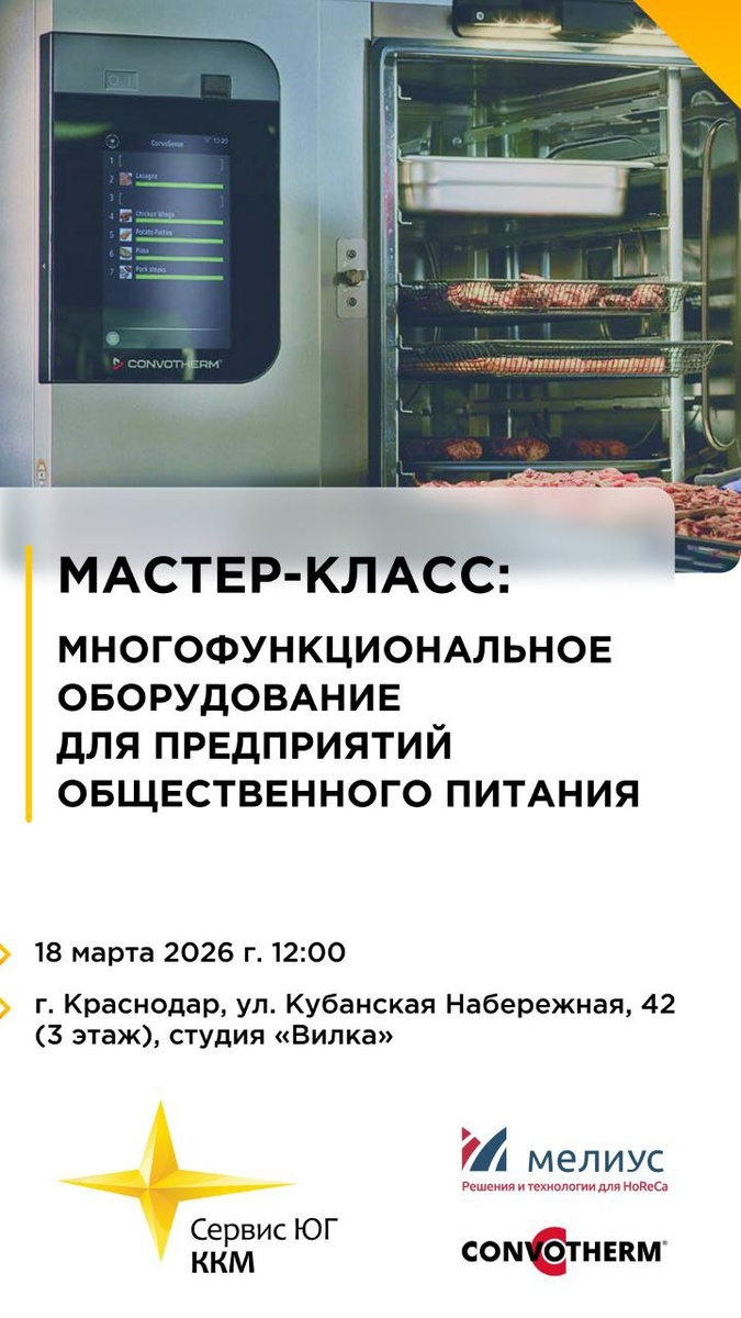 Компания «Сервис-ЮГ-ККМ» и бренд Convotherm приглашают шеф-поваров и рестораторов Краснодара на эксклюзивный мастер-класс. Вместе с нашими партнерами — компанией «Мелиус» — мы покажем, как современный пароконвектомат может повысить эффективность вашего производства. Разберем практические кейсы работы с сезонными продуктами Краснодарского края и приготовление идеальных базовых блюд. Оборудование — это не просто техника, это инструмент для побед на кухне. В программе: ✅ Как сократить время приготовления без потери качества ✅ Как один аппарат справляется с разными задачами: от варки на пару до запекания ✅ Как адаптировать технологии под локальные продукты и сезон 📅 Когда: 18 марта 2026 года в 12:00 📍 Где: Краснодар, ул. Кубанская Набережная, 42 (3 этаж), студия «Вилка» Участие бесплатное, но количество мест ограничено. Обязательная регистрация по ссылке или по телефону: +7 925 399-26-38 (Татьяна Бибикова). Ждем вас, чтобы приготовить лучшее вместе!