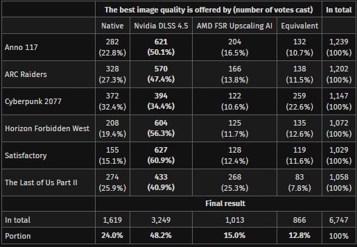 В двухнедельном исследовании приняли участие более 6,7 тыс. человек, которым показывали записи геймплея в 4K без указания типа апскейлинга. Игроки выбирали между нативным разрешением с TAA, DLSS 4.5 «Качество» и FSR4 «Качество» в играх Anno 117, ARC Raiders, Cyberpunk 2077, Horizon Forbidden West, Satisfactory и The Last of Us Part II. DLSS лидировала во всех проектах, а нативное разрешение близко подобралось только в Cyberpunk 2077. DLSS получила 48,2% голосов, нативное разрешение — 24%, FSR4 — 15%, оставшиеся 12,8% участников не заметили разницы.