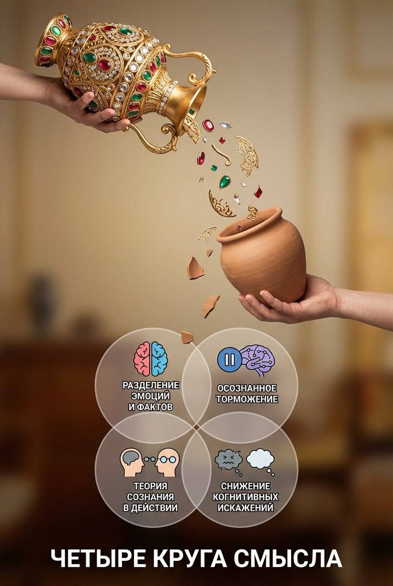 ? Практика «Четыре круга смысла»: инструкция для взрослой коммуникации почему мы говорим, но нас не слышат Представьте, что вы подарили другу драгоценную вазу. По дороге к нему она постепенно теряла детали: сначала орнамент, потом ручки, в итоге он получил простой глиняный горшок. Примерно так путешествуют наши мысли, превращаясь в слова. Практика «Четыре круга смысла» основана на простой, но революционной идее: большинство конфликтов происходит не из-за разногласий, а из-за потерь смысла на пути от мысли к пониманию. Мы живём в огромном внутреннем мире, но до собеседника доходят лишь его обломки. Почему это работает? С точки зрения нейронауки, эта практика — тренажёр для префронтальной коры, нашего центра осознанного контроля: 1️⃣. Разделение эмоций и фактов. Миндалина (центр страха) и префронтальная кора (центр логики) часто конфликтуют. Выписывая мысли в первом круге, вы «разгружаете» лимбическую систему, давая коре пространство для анализа. 2️⃣. Осознанное торможение. Практика