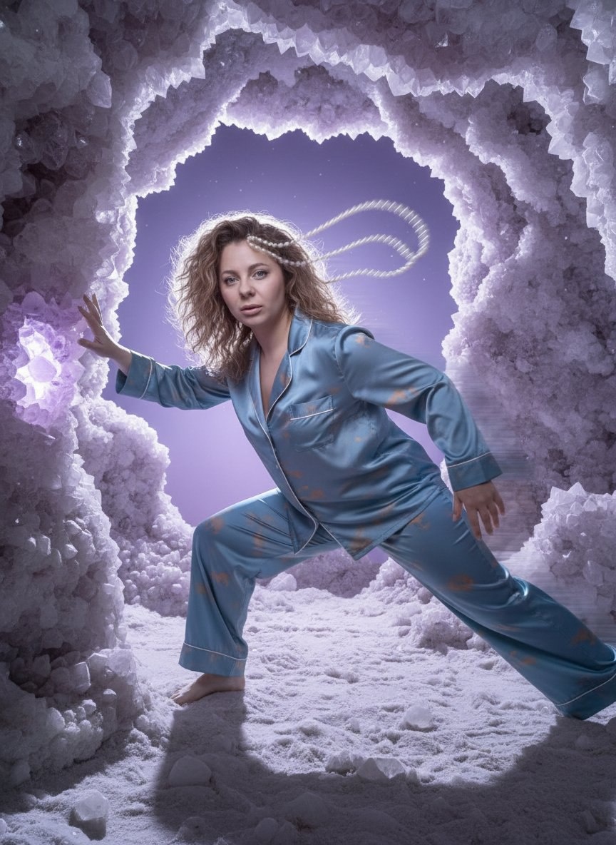 ** 🎨 Промпт: ** A portrait of the woman from the reference photo, her facial features and likeness unchanged, captured in a dynamic action pose. She lunges forward with intense focus in an expansive crystal cave, one hand grazing a giant, glowing amethyst formation. She wears silk pajama loungewear in ocean blue, a single strand of pearls whipping through the air. The scene is illuminated by dramatic studio Rembrandt lighting, casting soft shadows, while a dusk with a purple sky is visible through the cave entrance. An infrared photography look desaturates the image, emphasizing the ethereal blues and sandy neutrals of the crystals and her attire. Motion blur accentuates her powerful, fluid movement. Банк Промптов | Твои Идеи