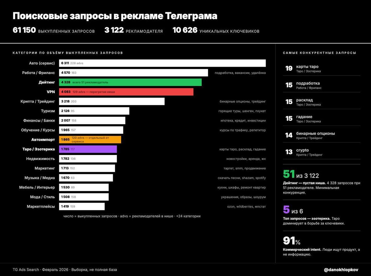 3 100+ рекламодателей, 10 600 уникальных ключевиков. Это реклама, которая показывается, когда ты ищешь в поиске “москва купить шубу” или “клодкод скачать бесплатно” Пара инсайтов: 🟥 Таро — самый конкурентный запрос в Телеграме 19 рекламодателей одновременно выкупают «карты таро». 5 из 6 топовых запросов — эзотерика. Обогнали крипту. Мб просто особенность сборки данных. 🟥 Дейтинг — пустая ниша 4 328 запросов при всего 51 рекламодателе. Для сравнения: у VPN 4 083 запроса и 129 конкурентов. Данные далеко не полные. Больше цифр на скрине (сори за шакал) @ohld