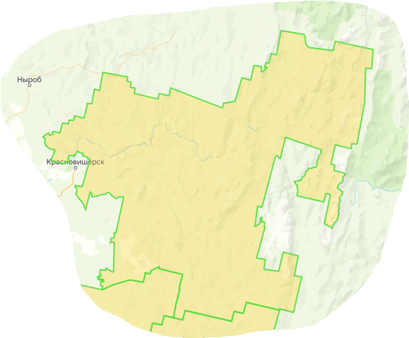 Южная граница - от точки с координатами 60.096349 N, 56.885490 E границе Красновишерского района до точки с координатами 60.119960 N, 56.648597 E