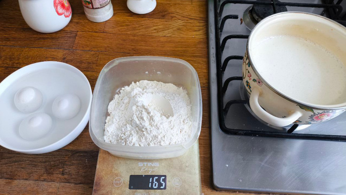 Всем приветы, всем приветы! Всегда делал заварные блины. Ну вот это вот когда стакан муки разводишь в стакане молока до "без комочков", а потом вваливаешь туда стакан кипятка, месишь и докидываешь яичко или два. Вчера на канале Алесандра Селезнева вышел новый шортс с НЕ заварными блинами по случаю масленицы и я решил изменить своим традициям.)) Я делал: 165 г муки, 550 мл молока, 1/2 чл соли, 35 г сахара, 3 яйца С1, 50 г подсолнечного, 20 г сливочного. Яйца кинул в тёплую воду из-под крана до всех операций, дабы согрелись до +- комнатной В молоко добавил соль, сахар, подсолнечное масло, немного сливочного. Подогрел это всё помешивая до градусов 40-ка (как слегка горячеватая вода из-под душа) и убедился что сахар с солью растворились. Влил примерно 50% молока в муку и венчиком перемешал до состояния "без комочков". Массу зафигачил в остатки молока и разбил в это всё 3 яйца. Достал Витька и пробил всё до однородности, около 3-х минут заняло. И пошел за компик, дабы глютен в очередной раз
