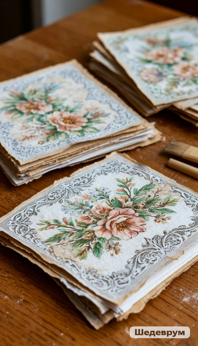 Процесс декупажа требует абсолютной тишины и концентрации. Ты вырезаешь фрагмент (я предпочитаю не вырезать, а аккуратно вырывать, чтобы края были более естественными, «живыми»), отделяешь два лишних слоя салфетки и берешь в руки тончайший, почти невесомый верхний слой с рисунком. Он так и норовит свернуться, порваться, прилипнуть к пальцам. Он капризен, как муза.