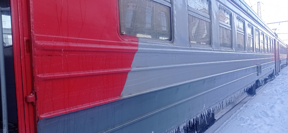 Электричка попалась атмосферная - давнего года выпуска. Меня впечатлили сугробы между вагонами и сосульки на окнах)