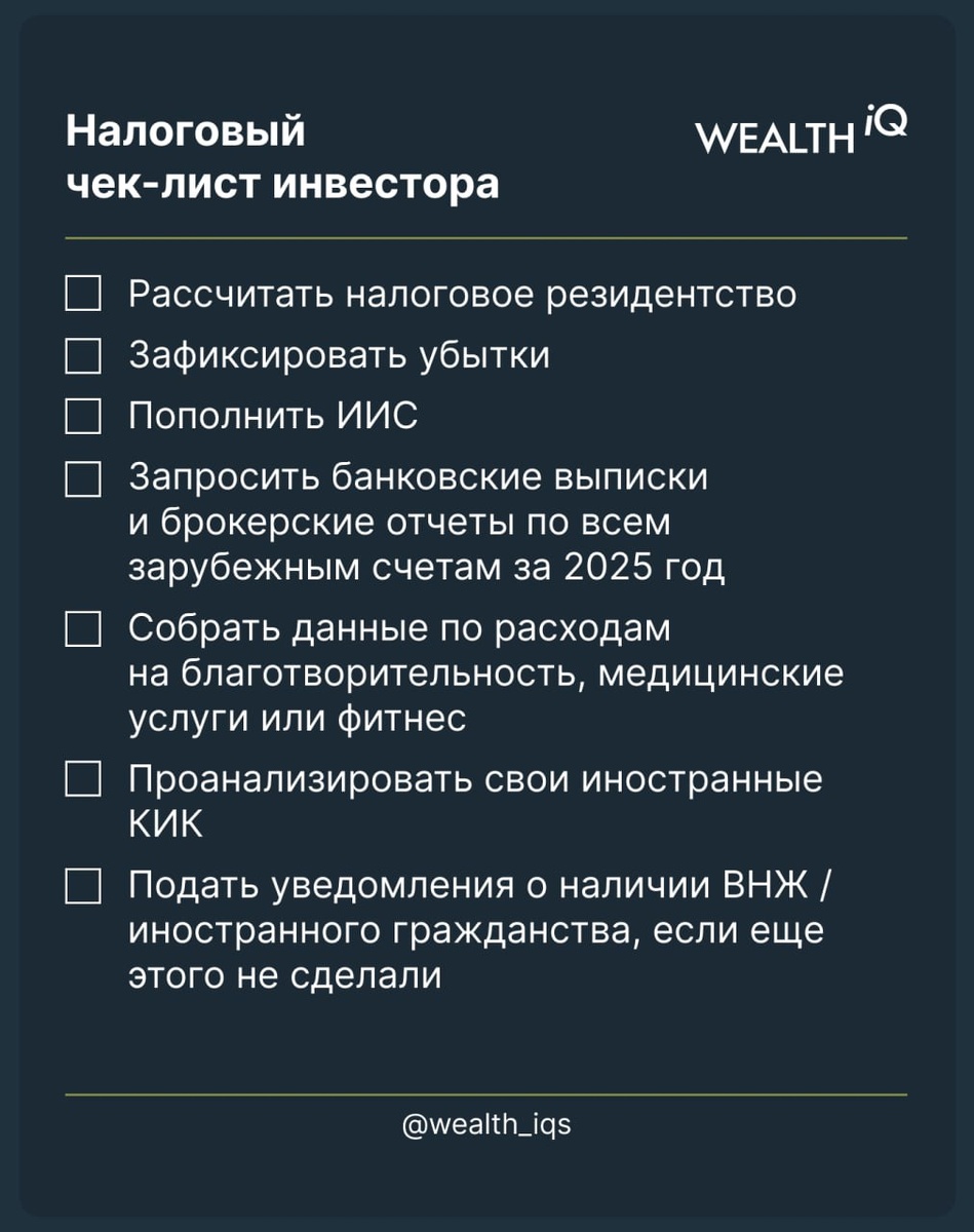 Период подготовки персональной отчетности в налоговые органы за 2025 год идет полным ходом. Собрали для вас несколько важных материалов: 1. Чек-лист. Прикрепляем его к этому посту. Подробности можно почитать здесь. 2. Подкаст с полным гайдом по налогам. Это выпуск подкаста «Объясни Марату». Смотрите его в YouTube и Дзене, слушайте в Яндекс.Музыке и Apple Podcasts. 3. Важная (и приятная) деталь для тех, кто ведет свой инвестиционный портфель вместе с инвестиционным консультантом, — узнайте о ней здесь. Мы можем помочь вам с подготовкой налоговой декларации. За подробностями, пожалуйста, обращайтесь к своему банкиру Wealth IQ. #налоги 🏦 Wealth IQ Дисклеймер