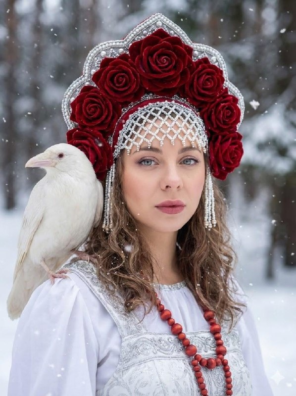 промпт: Close-up fashion portrait of a beautiful Russian woman in a winter setting. She wears a magnificent Kokoshnik headdress adorned with large red velvet roses, intricate silver beadwork, and a pearl mesh covering her forehead. She wears a white dress with silver embroidery and chunky red wooden beads. A white albino raven sits calmly on her shoulder. Her makeup is soft and glamorous with rose lips. Background: snowy white forest, falling snowflakes, soft daylight, cinematic depth of field, 8k, photorealistic. Банк промтов | Твои идеи