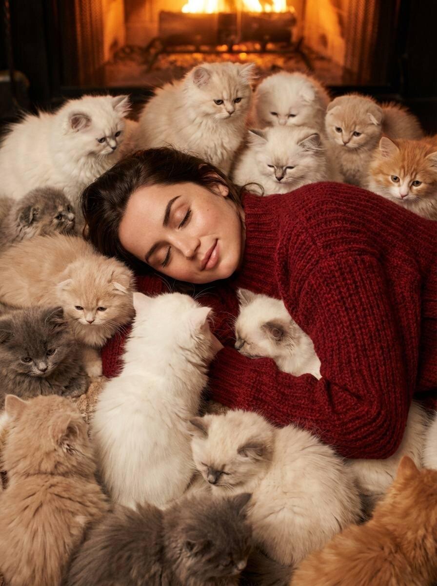 Модель: Nano Banana Сгенерировать🪄 Уютный, мечтательный модный портрет молодой женщины, лицо и личность которой основаны на предоставленной фотографии. Используйте изображение-образец, чтобы точно воспроизвести черты лица, пропорции, тон кожи и общее сходство женщины, сохраняя при этом ее естественный вид. Ее окружают десятки невероятно пушистых котят разных пород, заполняющих весь кадр, словно мягкое живое облако. Чрезвычайно длинная, густая, воздушная шерсть с плюшевой текстурой и максимальным объемом, мягкие ореолы вокруг каждого котенка. Смесь британских короткошерстных, шотландских вислоухих, мейн-кунов, рэгдоллов, персидских и норвежских лесных котят. Все котята маленькие, чистые, здоровые, с детскими пропорциями, большими глазами, круглыми мордочками, белого, кремового, бежевого, серого и нежно-рыжего оттенков, с гиперреалистичными деталями шерсти. Женщина спокойно лежит в центре, словно отдыхая у камина, с нежно закрытыми глазами или с мягкой, мирной улыбкой, создавая глубо