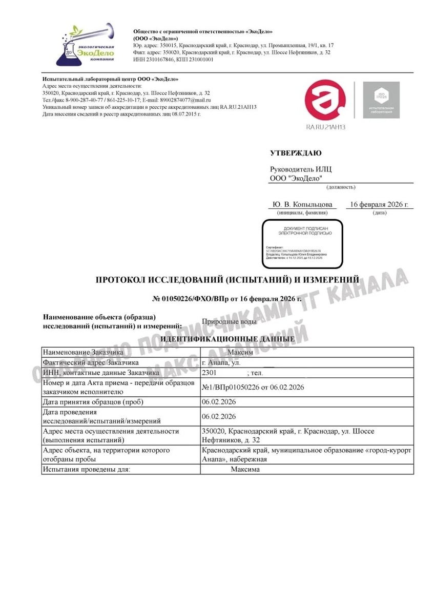 ❓ 22 августа 2025 года на личном приеме и.о. начальника Роспотребнадзора в г.-к. Анапа сообщила, что предельно допустимая концентрация нефтепродуктов в морской воде составляет 0,3 мг/дм3. На официальные запросы ответа не поступало. Предельно допустимая концентрация (ПДК) — это максимальная концентрация вредного вещества в окружающей среде, которая при постоянном воздействии в течение длительного времени не вызывает патологических изменений или заболеваний у человека и его потомства. Проще говоря, все что меньше ПДК - не вредит здоровью. 6 февраля 2026 года брал пробы моря, видео с геолокацией, временем можно посмотреть здесь. Пробы пломбировались, при сдаче пломбированных проб в Краснодаре присутствовало 3 сотрудника аккредитованной для таких типов проб организации. Сукко - 0,01 мг/дм3, что ме Показать полностью... 👉ВИТЯЗЕВО Вконтакте 👉Чат ВИТЯЗЕВО в Тг Витязево 👉Канал Витязево в Тг 👉ДЖЕМЕТЕ ВК Предложить Новость @VPredlojka_bot