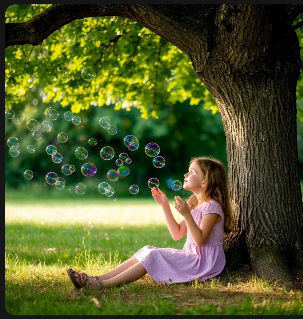 Я открыла глаза и внезапно, с кристальной ясностью, осознала: я лежу на траве. Подняв голову, я увидела, что нахожусь в бескрайнем парке, где в небо уходили кроны вековых дубов. Под каждым дубом сидела девочка. Все они занимались одним и тем же — медленно, словно в ритуале, выдували мыльные пузыри. Девочки улыбались, провожая взглядами свои творения. Пузыри переливались всеми мыслимыми оттенками: алые, как закат, изумрудные с бирюзовыми прожилками, а иные — мутно-серые, похожие на сигаретный дым, застывший в воздухе.